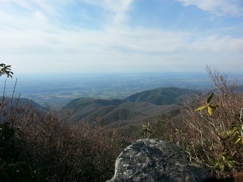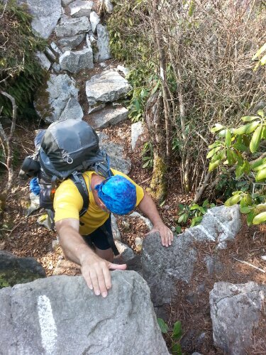 Friday we crossed a long, exposed ridgeline called Firescald Knob, a narrow trail with steep drops on both sides and incredible, expansive views in every direction. The climb down was rocky and difficult, the first time we had to put our poles away and climb backwards because a descent was so steep…maybe I am easily amused, but I really enjoyed that.