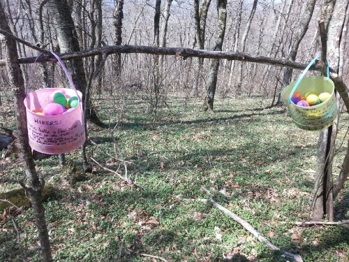 I should probably quit making broad declarations like this, but I think this has been my favorite stretch of hiking so far. The trail is beautiful and well-maintained, the views are stunning, my neck has improved gradually every day, and the weather has been mostly cooperative (more on that in a minute). It’s had the most trail magic I’ve seen so far, too, which certainly doesn’t hurt…whether it was Quiet Paul cooking eggs and hashbrowns, Easter baskets hanging in the woods, Brother Tom with hot coffee and homemade brownies, passing sightseers with bananas, a day-hiker who shared half his PB&J sandwich (he said he likes to save his extra food until he sees someone who looks like they really need it), or just all the friendly people around town offering rides and answering our questions.