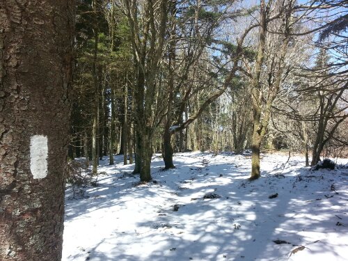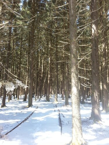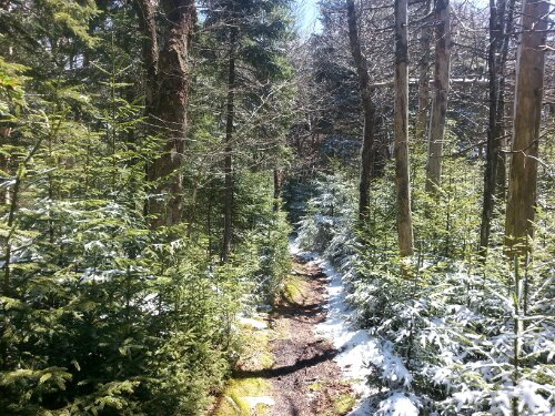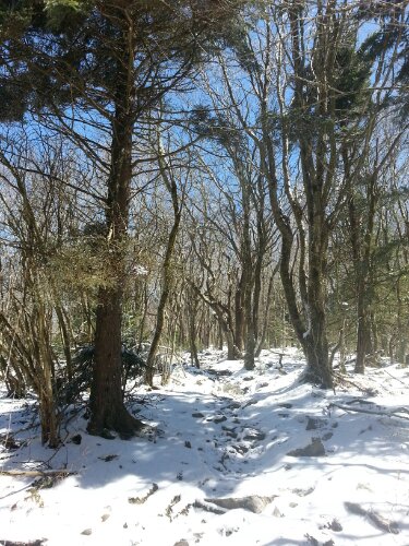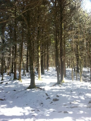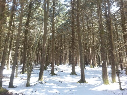 Eventually I’ll stop being surprised by how quickly and drastically the weather improves, but I was shocked by how perfect today was. (All these snow pictures are from today, which is why the sky is blue…my hands were way too numb to take pictures when everything was wet yesterday.) Tom shuttled me back ahead to Beauty Spot Gap while Tank and J-Rex were starting 12 miles behind in Erwin, so I hiked alone all day…and it might have been my favorite day yet. There was still a blanket of fresh snow at high elevations, and the top of Unaka Mountain was covered in a dense forest of spruce trees, possibly the coolest thing I’ve walked through so far. The temperature has warmed steadily all day, and the skies are clear and sunny.