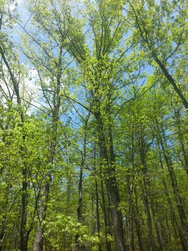 Then, all of a sudden, it was here. I had a week of clear, sunny weather, the trees are green and growing greener by the day, and the woods are coming to life: snakes, spiders, deer, and a greater variety of birds than I ever imagined hearing at once (mostly beautiful and inspiring, except for one car alarm bird that insists on singing in the middle of the night). No bears for me yet, but others have started seeing them.